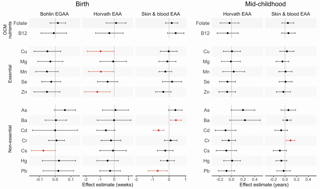 Understanding how prenatal exposures with well-established associations with infant and child health may affect EAA can support the development of early-life epigenetic biomarkers and increase understanding of how the intrauterine environment shapes health across the life course. This study used data from the Project Viva pre-birth cohort to investigate the extent to which first-trimester OCM micronutrients and essential and non-essential metals are associated with EGAA and EAA at birth and in childhood. We hypothesized that two OCM nutrients, folate and B12, as well as essential metals (Cu, Mg, Mn, Se, and Zn) would be associated with lower EAA while non-essential metals (As, barium (Ba), Cd, chromium (Cr), cesium (Cs), Hg, and Pb) would be associated with greater EAA. However, considering that EGAA is a measure of epigenetic maturity specifically at the time of birth, we hypothesized that OCM nutrients and essential metals would be positively associated with EGAA and non-essential metals would be negatively associated with EGAA. We also investigated nonlinear associations and associations with mixtures of micronutrients and metals.