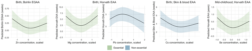We evaluated nonlinear associations using restricted cubic splines. We found significant nonlinear associations of two essential metals: Zn with Bohlin EGAA and Mg with Horvath EAA (p < 0.05) (Table 2). Both of these splines were U-shaped, indicating greater epigenetic aging at low and high Zn and Mg concentrations (Figure 2). Among non-essential metals, there was a significant nonlinear association of Pb with Horvath EAA and Cs with skin and blood EAA (p < 0.05). For Pb and Horvath EAA, the spline had an inverse U-shape, with lower predicted EAA at low and high Pb concentrations, whereas for Cs and skin and blood EAA, the spline was U-shaped.