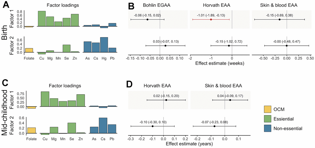 We evaluated associations of micronutrient and metal mixtures with EGAA and EAA using EFA, which is appropriate for analyzing related exposures with a known common source [45]. Vitamin B12, Ba, Cd, and Cr were excluded from EFA based on their measure of sampling adequacy (MSA) values. EFA was conducted using scaled micronutrient and metal concentrations with a two-factor model and an oblique rotation based on the scree plot and the Bayesian Information Criterion (BIC). Factors 1 and 2 were weakly correlated with each other (rPearson = 0.16) and together explained 30% of variance in the prenatal micronutrient and metal exposures. Both factors had low loadings for folate, whereas, overall, Factor 1 had the greatest loadings for essential metals and Factor 2 had the greatest loadings for non-essential metals (Figure 3A). Similarly, folate had the greatest uniqueness (i.e., variance not explained by the EFA model) (u2 = 0.96). High uniqueness scores were also observed for Mn (u2 = 0.94) and Pb (u2 = 0.92). Associations of continuous factor scores with EGAA and EAA were analyzed using adjusted robust linear models, including both factor scores simultaneously. Factor 1 was negatively associated with Horvath EAA (B (95% CI) = -1.01 weeks (-1.89, -0.13)) (Figure 3B). The effect estimate of Factor 1 with Bohlin EGAA was also negative but not statistically significant (B (95% CI) = -0.06 weeks (-0.15, 0.02)).