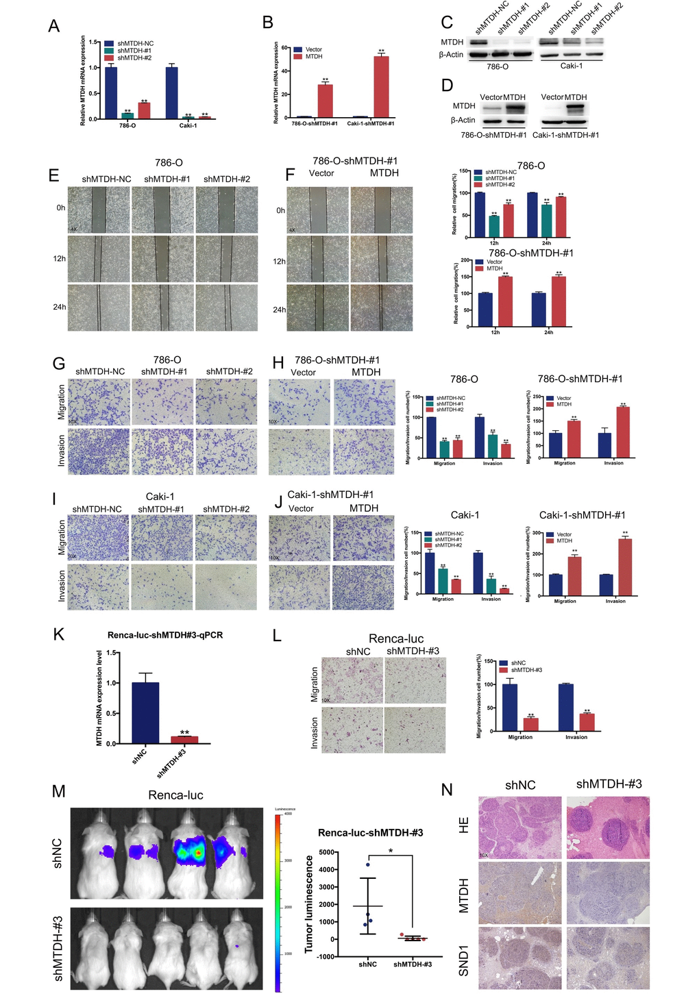This article has been corrected: It was found that there is the overlap between the images showing migration and invasion of Caki-1-shMTDH-KD1-MTDH cells in Figure 3J. The authors confirmed that the image of transwell invasion of Caki-1-shMTDH-KD1-MTDH cells was misplaced during the figure layout. They provided the original images of the transwell assays and corrected Figure 3J with the proper image obtained from the original data. The authors also would like to clarify the use of the same western blot images in Figures 3D and 4E, depicting MTDH and β-actin expression in 786-O-shMTDH-#1 cells. The purpose was to demonstrate the efficacy of MTDH overexpression in lentivirus-infected cells, which is now stated in the legend to Figure 4E. These corrections do not change the results or conclusions of the article. The authors apologize for any confusion or inconvenience possibly caused.