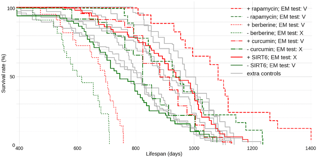 To further study the life expectancy standard for male C57BL/6J we selected ‘meta-controls’ - control data from several papers where C57BL/6J mice came from two sources: The National Institute of Aging [4–6] and Jackson Laboratories [7, 8] and the origins and conditions of the control animals were described in sufficient detail. Across these studies, the median longevity varies between 800 and 970 days – less than in studies with C57BL/6J males in general. Crucially, even this range far exceeds the typical difference between the median lifespan of a “successful” intervention and control groups, which generally does not exceed 15%. Indeed, when we looked at some of the best-known studies on experimental life extension in C57BL/6J males - we found that in most cases the median lifespan of the experiment, although significantly longer than that of respective control - still did not exceed the longest median lifespan across the ‘meta-controls’ [7] (Figure 1) - one notable exception being the rapamycin [9]. Each dataset also was tested with our newly developed extra-mortality test (see Supplementary Materials and Methods) showing if the given dataset contains implausible instantaneous increase in mortality. A sudden burst of deaths suggests latent issues.