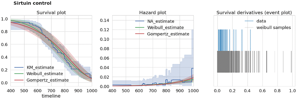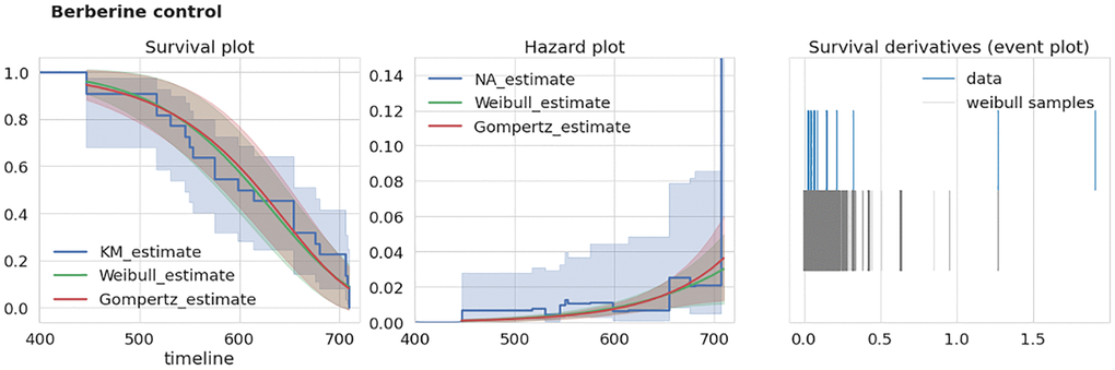 To test the consistency of a given dataset we developed an extra-mortality test checking if the given dataset has an “unexpected” increase in mortality by comparison with two reasonable models of survival curves. To test this for a given dataset we first estimate a time derivative dŜ/dt of its corresponding survival function estimate Ŝ (we used Kaplan-Meier estimator of S). Next, we estimate this derivative using samples drawn from corresponding Weibull and Gompertz approximations of S. The example of S estimates for two different datasets are given in the left panels of Figures 2, 3. To account for different sample times (i.e., times when researchers recorded the number of dead mice) for Weibull and Gompertz estimates, we used measurement times as in the original experiment, thus binning the observations similarly. By repeating sampling from model distributions 1000 times we compared maximal derivative (vertical step of survival curve) of Kaplan-Meier estimate dŜ/dt of original survival curve with model-sampled (Figures 2, 3, right panels). If the maximal derivative in the original study is greater than one from 1000 model samples we consider such a dataset having the extra-mortality artifact. For example, “Sirtuin control” dataset doesn’t have extra-mortality by comparing with 1000 samples from the Weibull model of the dataset (Figure 2, right event plot), and, thus, can be considered as of high quality. In contrast, “Berberine control” has such an artifact (Figure 3, right event plot) and should be analyzed with caution.