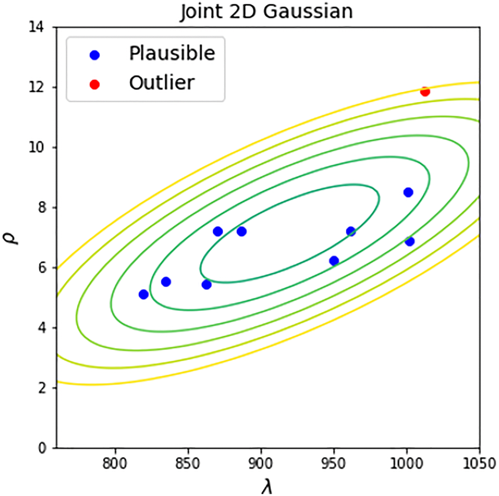 Once the reference distribution is computed we may use it for testing the “plausibility” of a new dataset. This can be achieved by estimating its parameters λ and ρ of corresponding Weibull fit and by computing the distance of the obtained vector of parameters to the corresponding mean vector of the reference distribution by simply applying Hotelling’s T-squared test (Figure 4). The result of the test is a value of statistics (squared Mahalanobis distance) and p-value. By accepting a reasonable value of significance α (we propose to use 0.01), this p-value can be used for testing the plausibility of a new dataset. If p-value is small - the dataset is implausible because of its dissimilarity with high-quality controls.
