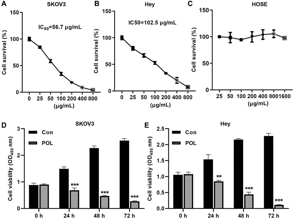 First, we examined the effect of POL on the malignant proliferation of ovarian cancer cells. As shown in Figure 1A, 1B, POL decreased the viability of SKOV3 and Hey cells in a dose-dependent manner. Among them, in SKOV3 cells, the IC50 was 56.7 μg/ml; while in Hey cells, the IC50 was 102.5 μg/ml. In the next experiments, we chose 50 and 100 μg/ml of POL to treat SKOV3 and Hey cells, respectively. We also tested whether the same concentration of POL affected the proliferation of HOSE in mammary epidermal cells. CCK-8 assay revealed that the same concentration of POL had almost no effect on the proliferation of HOSE (Figure 1C). Moreover, POL at 24 h, 48 h, 72 h, 50 and 100 μg/ml attenuated the viability of SKOV3 and Hey cells and showed a time gradient dependence (Figure 1D, 1E).