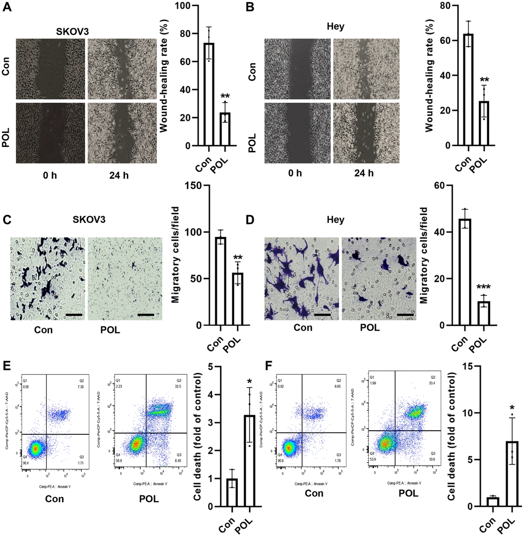 Scratch assay revealed that 50 and 100 μg/ml of POL significantly inhibited the migration of SKOV3 and Hey cells at 48 h (Figure 2A, 2B). Similarly, transwell assay also confirmed that POL could effectively inhibit the migration rate of SKOV3 and Hey cells (Figure 2C, 2D). Flow cytometry results revealed that 50 and 100 μg/ml of POL significantly increased the mortality of SKOV3 and Hey cells (Figure 2E, 2F). These results suggested us that POL could effectively improve the malignant proliferative phenotype of ovarian cancer in vitro.