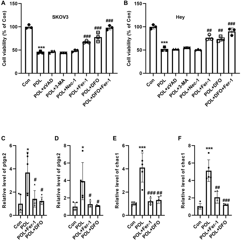 Next, we analyzed by which way POL induced SKOV3 and Hey cell death. W SKOV3 and Hey cells were pre-incubated with an apoptosis inhibitor (Z-VAD-FMK, 20 μM), an autophagy inhibitor (3-methyladenine, 3-MA, 20 μM), a necrosis inhibitor (Necrostatin-1, Nec-1, 10 μM), and a Ferroptosis inhibitor (Ferrostatin-1 (Fer-1) and Deferoxamine (DFO), 1 μM) for 1 h, followed by continued co-incubation with POL for 24 h. As a result, it was found that only Fer-1 and DFO were able to reverse POL-induced decrease in ovarian cell viability (Figure 3A, 3B). Specifically, in SKOV3 and Hey cells, POL reduced the viability of SKOV3 and Hey cells to 45% and 50%, respectively, compared with the control. In contrast, Fer-1 (a lipid ROS scavenger) and DFO (an iron chelator) elevated SKOV3 and Hey cell viability to 67%, 77% and 78%, 74%, respectively. When the two were combined, SKOV3 and Hey cell viability increased to 98% and 90%, respectively (Figure 3A, 3B), suggesting that POL-induced ferroptosis is driven by iron-dependent lipid peroxidation. We further explored the effects of POL on two markers of ferroptosis, ptgs2 and Chac1. POL was able to significantly increase the mRNA levels of ptgs2 and Chac1 in SKOV3 and Hey cells (Figure 3C–3F). These results suggest that ferroptosis plays a dominant role in POL-induced cell death in ovarian cancer.