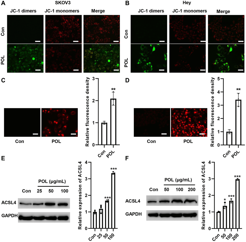We examined the effect of POL on MMP. As shown in Figure 4A, 4B, JC-1 was mainly present as JC-1 monomers in the control group, whereas after POL treatment, JC-1 was mainly present as JC-1 dimers, suggesting that POL induced a decrease in mitochondrial MMP, which led to mitochondrial dysfunction and triggered ferroptosis (Figure 4A, 4B). Meanwhile, POL significantly increased Fe2+ levels in SKOV3 and Hey cells (Figure 4C, 4D). We further detected the changes in ferroptosis-related protein expression. The results, as shown in Figure 4E, 4F, showed that POL increased the protein expression level of ACSL4 in a concentration gradient-dependent manner.