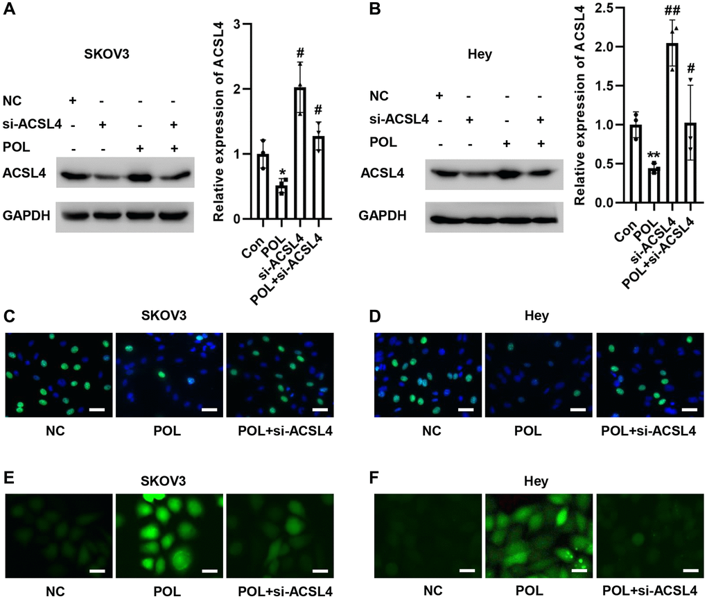 Next, we screened siRNAs specifically targeting ACSL4. si-ACSL4 effectively suppressed ACSL4 expression in SKOV3 and Hey cells as shown in Figure 5A, 5B. Meanwhile, POL-induced high ACSL4 expression was reversed to some extent by si-ACSL4 (Figure 5A, 5B). In addition, we examined the effect of POL on cell proliferation by EdU staining. Compared with the control group, POL reduced the proliferation of SKOV3 and Hey cells, and si-ACSL4 could reverse this effect (Figure 5C, 5D). Also, silencing ACSL4 reduced POL-induced lipid peroxidation in SKOV3 and Hey cells (Figure 5E, 5F). This result confirms that ACSL4 plays a major role in POL-mediated ferroptosis in ovarian cancer cells.