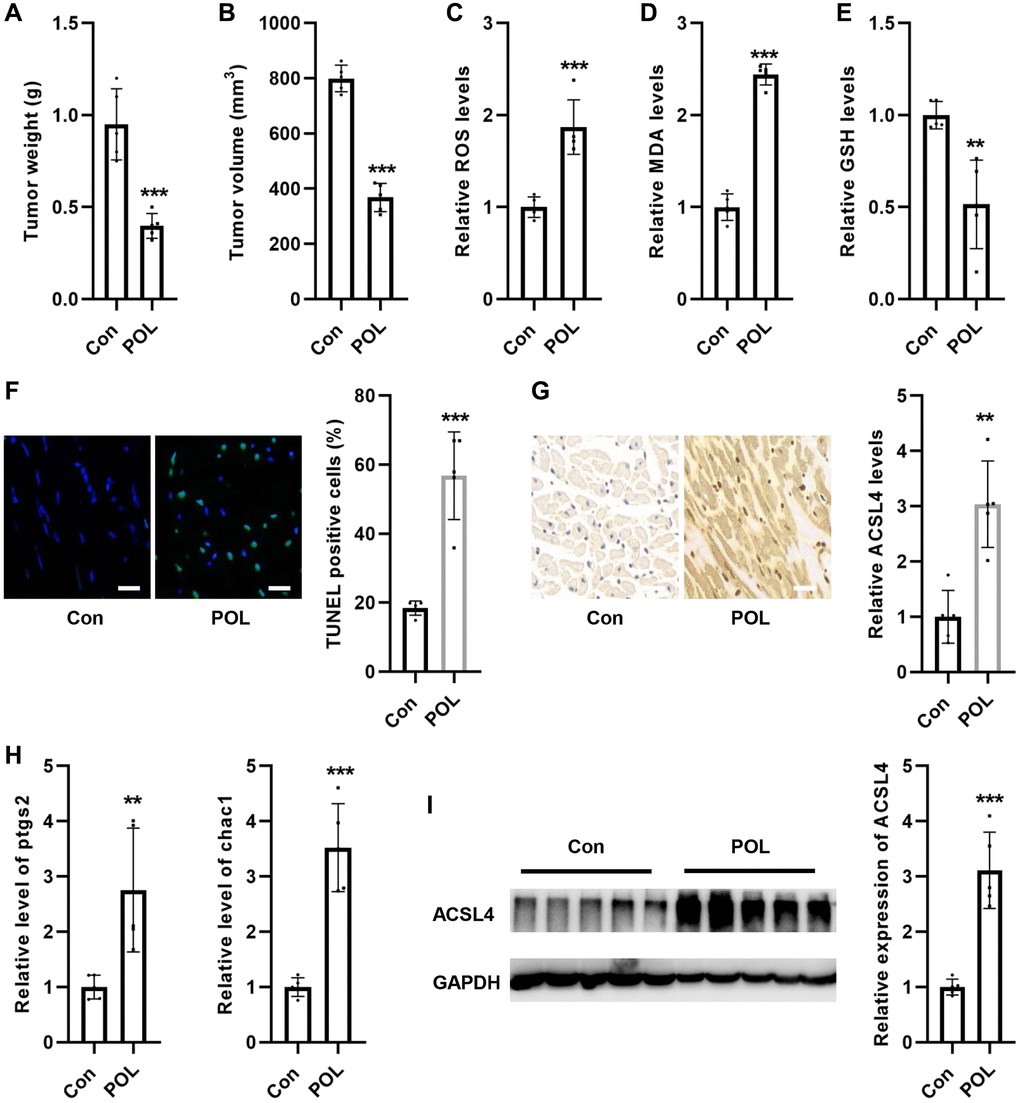 Next, we explored the effect of POL on tumor volume in mice in vivo. As shown in Figure 6A, 6B, POL significantly reduced tumor weight and volume. At the same time, POL increased the levels of ROS and MDA in mouse tumor tissues (Figure 6C, 6D). Conversely, POL decreased GSH levels in mouse tumor tissues (Figure 6E). TUNEL staining revealed that POL increased cellular mortality in tumor tissues (Figure 6F). IHC staining revealed that POL increased the levels of ACSL4 in tumor tissues (Figure 6G). RT-PCR results revealed that POL increased mouse tumor mRNA levels of ptgs2 as well as chac1 in the tissues (Figure 6H). Western blot similarly confirmed that POL increased the protein expression levels of ACSL4 in mouse tumor tissues (Figure 6I). These results suggest that POL is an effective cancer inhibitor.