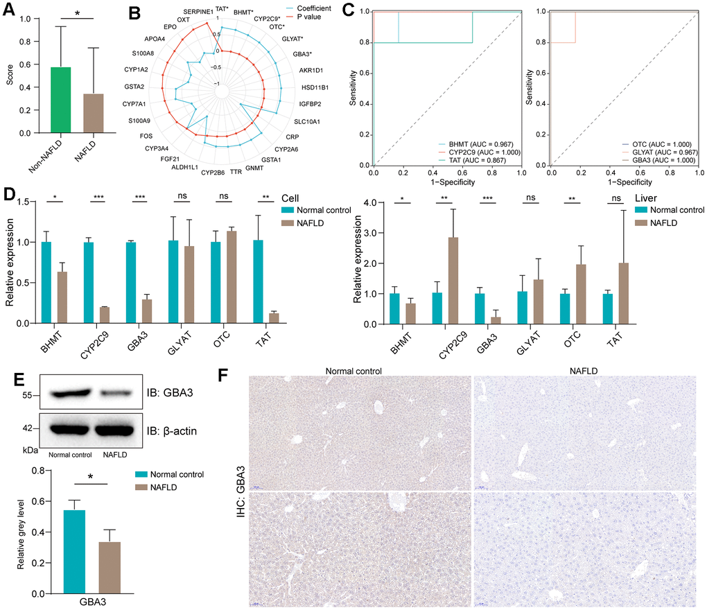 Through Pearson test, we identified six genes that were significant (Figure 2B). Receiver operating characteristic curves demonstrated that these six genes could potentially serve as biomarkers for NAFLD (Figure 2C). To determine the core genes, we used PCR to assess the expression levels of these six genes in the NAFLD model (Figure 2D). The data showed that GBA3 mRNA levels were significantly decreased both in vivo and in vitro. Therefore, further investigations were conducted. Western blotting and immunohistochemistry revealed that the protein levels of GBA3 were also significantly reduced in NAFLD (Figure 2E, 2F).