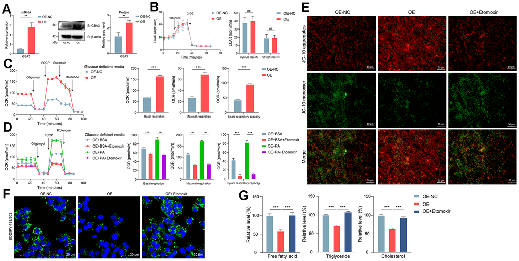 First, we stably overexpressed GBA3 in cells (Figure 3A). Previous studies have shown that GBA3 can hydrolyze various substrates, including β-glucose linked to hydrophobic groups [29]. This led us to explore its relationship with sugar metabolism before discussing the role of GBA3 in FAO. The data indicated that GBA3 had no effect on extracellular acidification rate, neither in glycolytic capacity nor in reserves (Figure 3B). In the absence of glucose, we found that GBA3 promoted FAO. The mitochondrial oxygen consumption rate significantly increased (Figure 3C). After supplementing with exogenous PA as a substrate, mitochondrial respiration capacity further enhanced (Figure 3D). The improvement in FAO led to an increase in JC10 aggregates (Figure 3E), suggesting a significant elevation in mitochondrial membrane potential, resulting in more energy production.