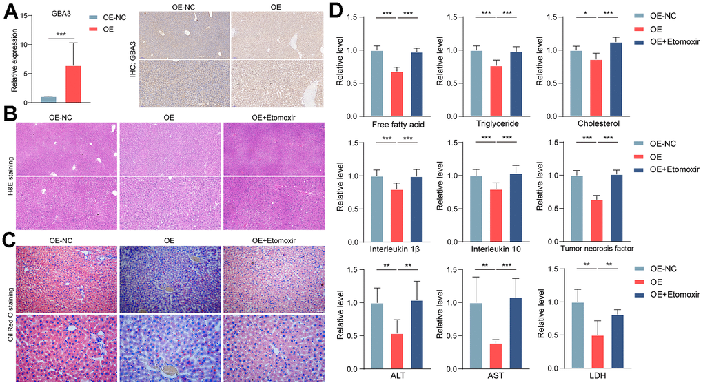Histological analysis showed that GBA3 alleviated hepatic steatosis induced by a high-fat diet (Figure 4B, 4C). Compared to the control group, GBA3 reduced lipid accumulation. Additionally, levels of inflammatory factors and transaminases in the liver were significantly decreased. Etomoxir partially reversed the effect of GBA3 (Figure 4D). These data support the physiological protective role of GBA3 in high-fat diet-induced NAFLD.