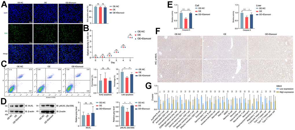 Necroptosis is a late-stage apoptosis that induces inflammation and infiltration of immune cells [31]. MLKL is the core mediator of necroptosis. Its phosphorylation is a specific and irreversible molecular event that drives necroptosis [32]. Consequently, we performed related experiments. As expected, GBA3 overexpression reduced the phosphorylation level of MLKL and the activity of Caspase 8 (Figure 5D, 5E). Similar trends were observed in vivo (Figure 5F). We divided all NAFLD samples from GSE160016 into high-expression and low-expression groups based on GBA3 expression level. Then, we compared the levels of immune cell infiltration between the two groups. The data showed that when GBA3 was highly expressed, the infiltration levels of activated B cells, natural killer cells, eosinophils, and T follicular helper cells decreased (Figure 5G). Most of the other changes in immune cells were not significant. These findings suggest that GBA3 can inhibit the transition of cells to necroptosis and prevent the occurrence of inflammation.