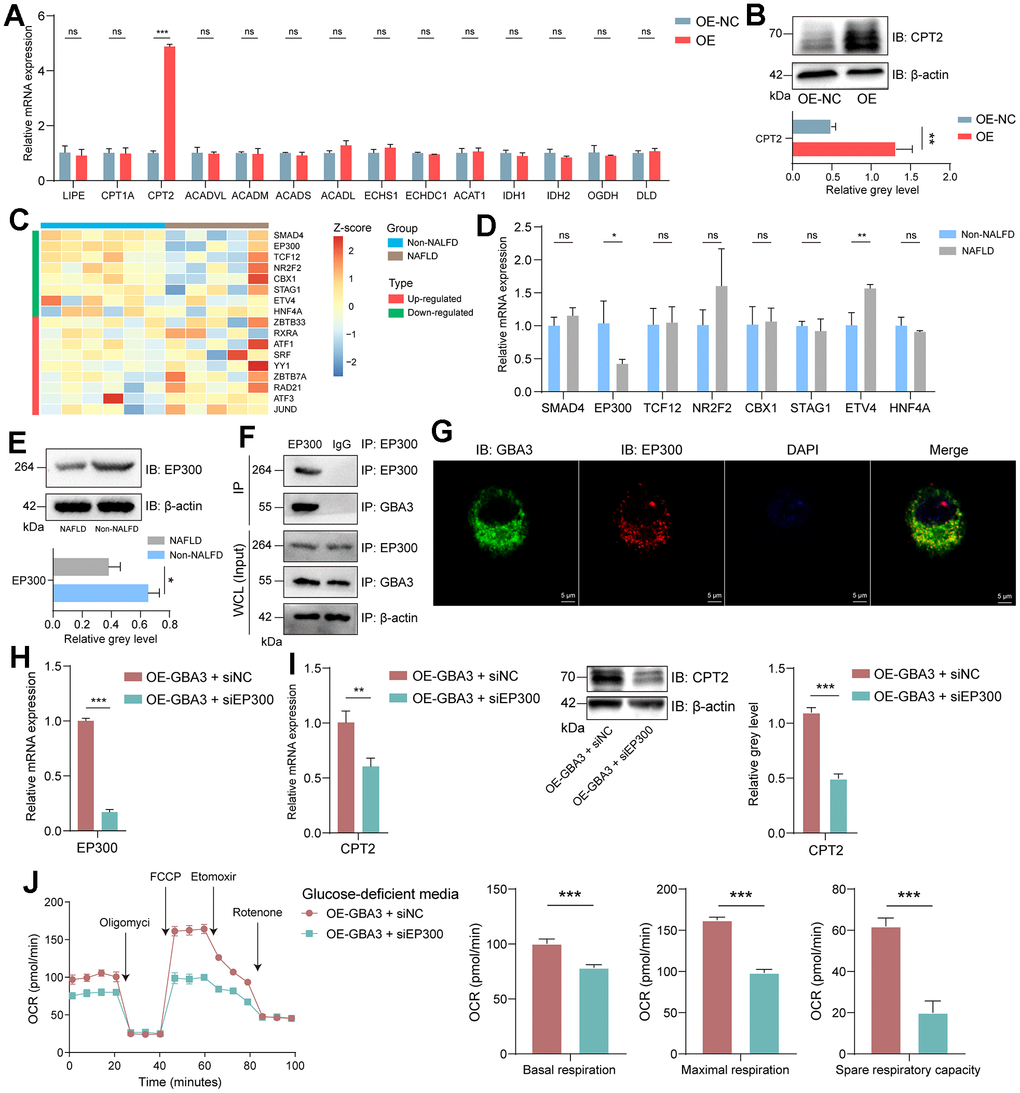 Finally, we focus on the specific mechanism of GBA3 in regulating FAO. FAO is regulated by a series of enzymes. PCR was used to preliminarily detect the expression levels of these enzymes. As shown in Figure 7A, the transcription level of CPT2 increased. WB showed an increase in the expression of CPT2 (Figure 7B). This indicates that CPT2 is involved in GBA3-mediated metabolic reprogramming. We obtained the transcription factors of CPT2 from the Cistrome Data Browser. Their expression in GSE160016 is shown in Figure 7C. As the expression of GBA3 is downregulated in NAFLD, we paid more attention to the transcription factors whose expression levels also decreased. PCR showed that only the expression of EP300 was decreased in the NAFLD cell model (Figure 7D). The results of WB further confirmed this finding (Figure 7E). As shown in Supplementary Figure 1, we demonstrated EP300 was transcription factor of CPT2 via ChIP. We infer the existence of interaction between GBA3 and EP300. Immunoprecipitation (Figure 7F) and immunofluorescence (Figure 7G) demonstrated our hypothesis.