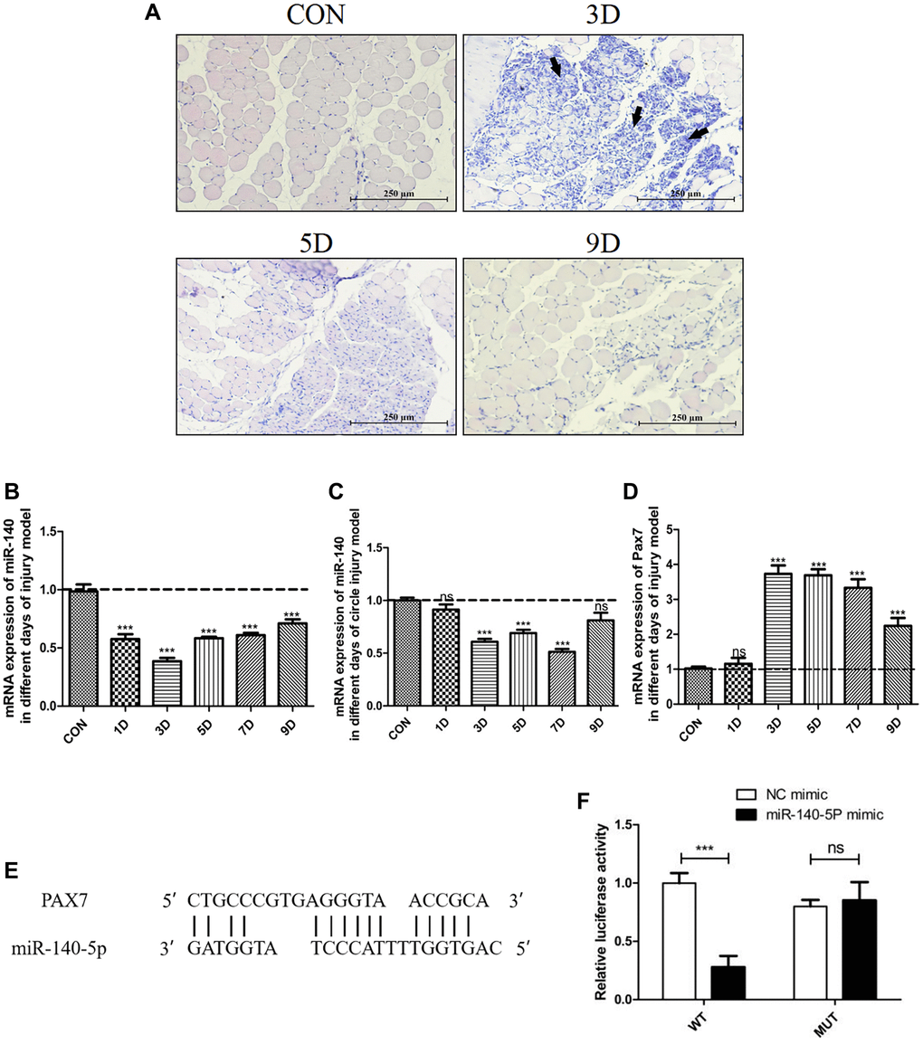 The expression of miR-140-5p was measured in the gastrocnemius muscle and circulating blood of the injury model at different time points. Compared to control mice, miR-140-5p expression significantly decreased in both the gastrocnemius muscle and circulating blood on days 1–5 following BaCl2 injury, gradually increasing on days 7–9. In contrast, the expression trend of the muscle satellite cell marker gene Pax7 was opposite to that of miR-140-5p (Figure 1B–1D).