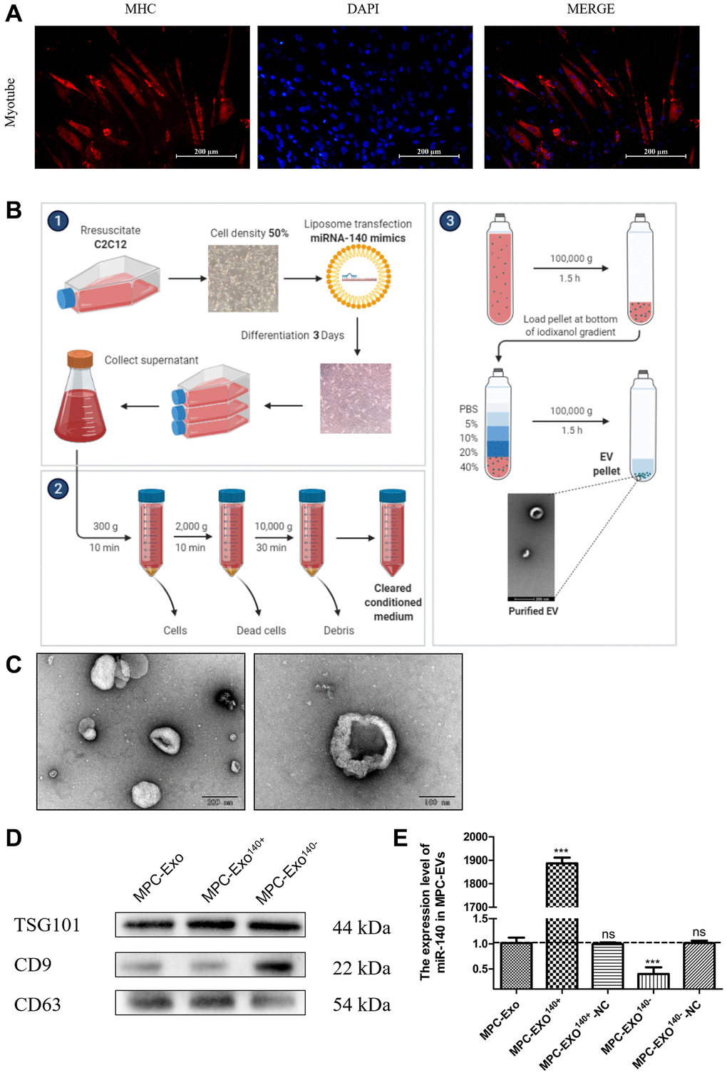 The isolation procedure for MPC-Exos was based on our previous work [23]. For engineered exosomes, miR-140-5p mimics and inhibitors (sequence information in Supplementary Table 1, Universal, Xuzhou, Anhui, China) were transfected into cells at 60% confluence using Lipofectamine™ 2000 (Thermo Fisher Scientific, Waltham, MA, USA). At 6 hours post transfection, cells were cultured in growth medium for 24 hours and then differentiated with 2% horse serum. When C2C12 (BFN608006353, Bluefbio, Shanghai, China) cells reached 80% differentiation, Dulbecco’s modified Eagle’s medium (BI, Kibbutz-Beit Hamek, Israel) without serum was added, and the cells were starved for 36 hours. The cell supernatant was collected and centrifuged to isolate the exosomes. The isolation steps included centrifugation at 300 × g for 10 minutes, 2000 × g for 10 minutes, and 10000 × g for 30 minutes to remove cell debris from the supernatant. The supernatant was then centrifuged (Preparative Ultracentrifuges, Hitachi, Japan) at 100000 × g for 90 minutes to obtain the exosomes, which were washed with PBS buffer and centrifuged again at 100000 × g for 90 minutes. The morphology of myogenic progenitor cell extracellular vesicles (MPC-EVs) was identified by transmission electron microscopy (TEM, Hitachi, Japan) after fixation, gradient dehydration, and gold plating. The exosomal proteins TSG101 (ab125011, Abcam), CD9 (98327, CST), and CD63 (52090, CST) were detected by Western blotting. The concentration and size of the exosomes were measured using nanoparticle tracking (NanoSight NS300, Malvern Instruments, Westborough, MA, USA) analysis.