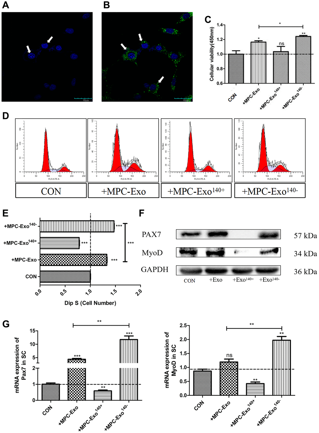 Activation of satellite cells by MPC-Exo and the interference of Pax7 expression by MPC-Exo140−, promoting satellite cell proliferation