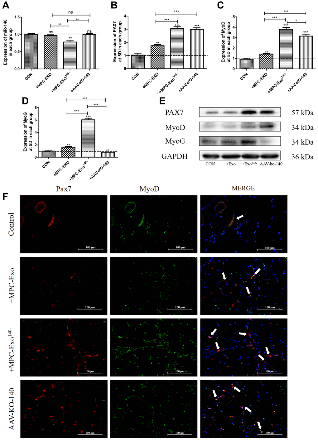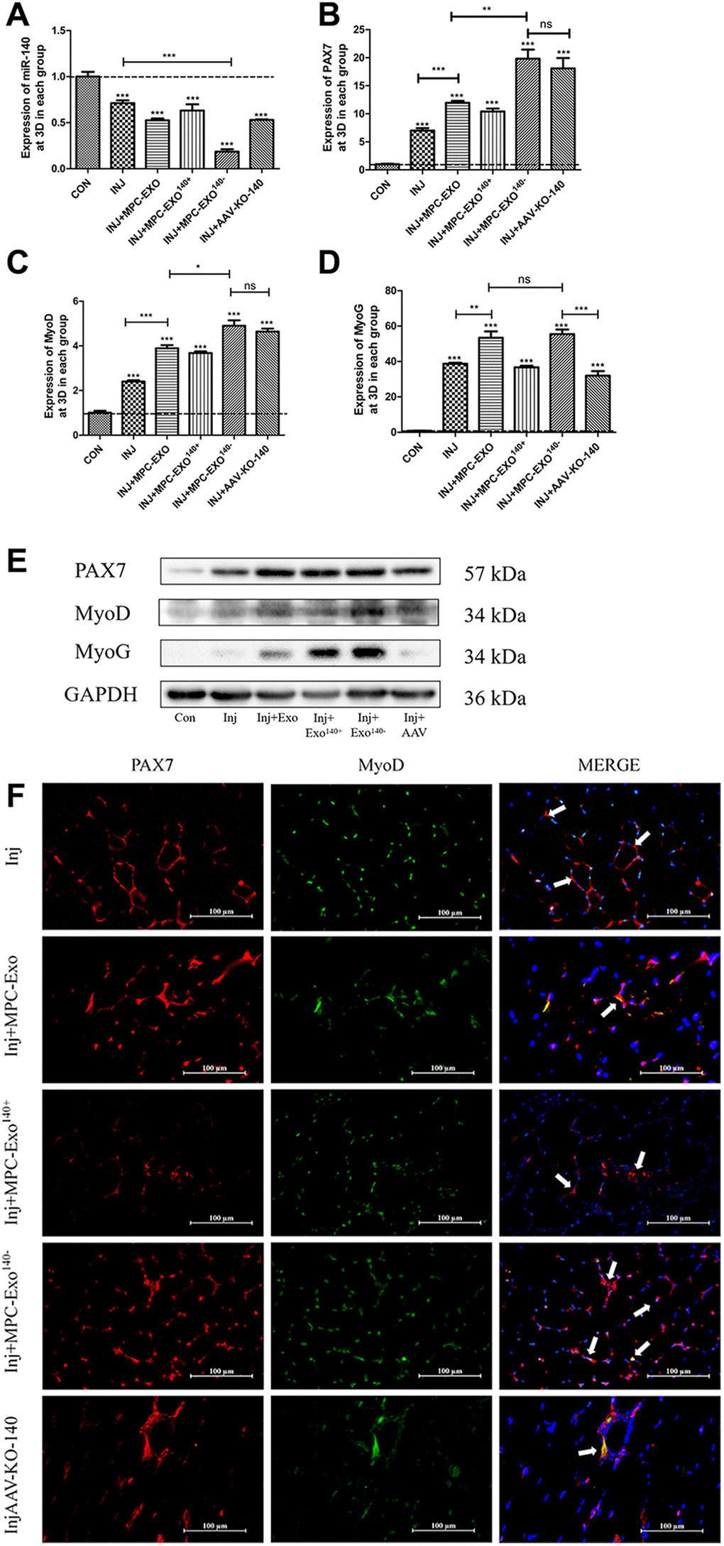 To investigate the roles of the aforementioned engineered extracellular vesicles and adeno-associated virus in skeletal muscle injury repair, we examined the location and expression changes of the satellite cell marker gene Pax7, as well as the muscle regeneration-related proteins MyoD and myogenin. The results showed that on the third day after injury, the expression levels of Pax7, MyoD, and myogenin significantly increased in the group injected with MPC-Exo140- compared to the injured group and the MPC-Exo group (Figure 6A–6E). In the MPC-Exo140− group, the number of Pax7+/MyoD+ cells significantly increased, indicating significant activation of satellite cells and promotion of muscle repair. Moreover, compared to the injection of muscle-derived extracellular vesicles, the repair process was accelerated in the MPC-Exo140− group (Figure 6F).