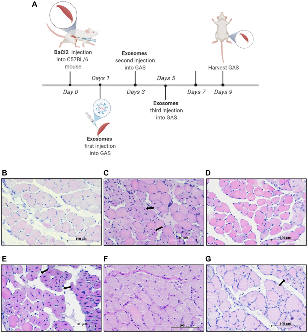 On days 1, 3, and 5 after the induction of skeletal muscle injury using BaCl2, 50 μL of MPC-Exo was injected into the right GAS muscle of 8-week-old mice, while 50 μL of PBS was injected into the GAS muscle of the sham-operated group as a control.
