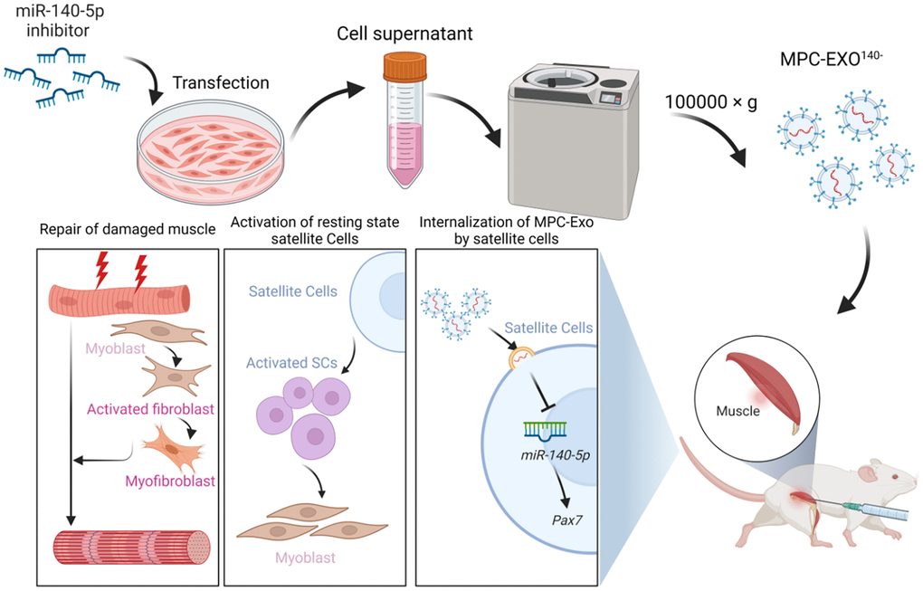 Based on these findings, it is hypothesized that myogenic exosomes carrying specific miRNAs, when injected into muscles, can regulate muscle satellite cells within the muscle, thereby affecting muscle injury repair. In this study, we aimed to produce and characterize engineered exosomes containing miR-140-5p mimics or inhibitors. Through in vitro experiments and acute injury models, we will coculture or inject these engineered exosomes, monitoring the activation and proliferation of muscle satellite cells. By evaluating the impact of engineered myogenic exosomes on muscle injury repair, we aim to provide a novel therapeutic strategy for the treatment of muscle injuries.