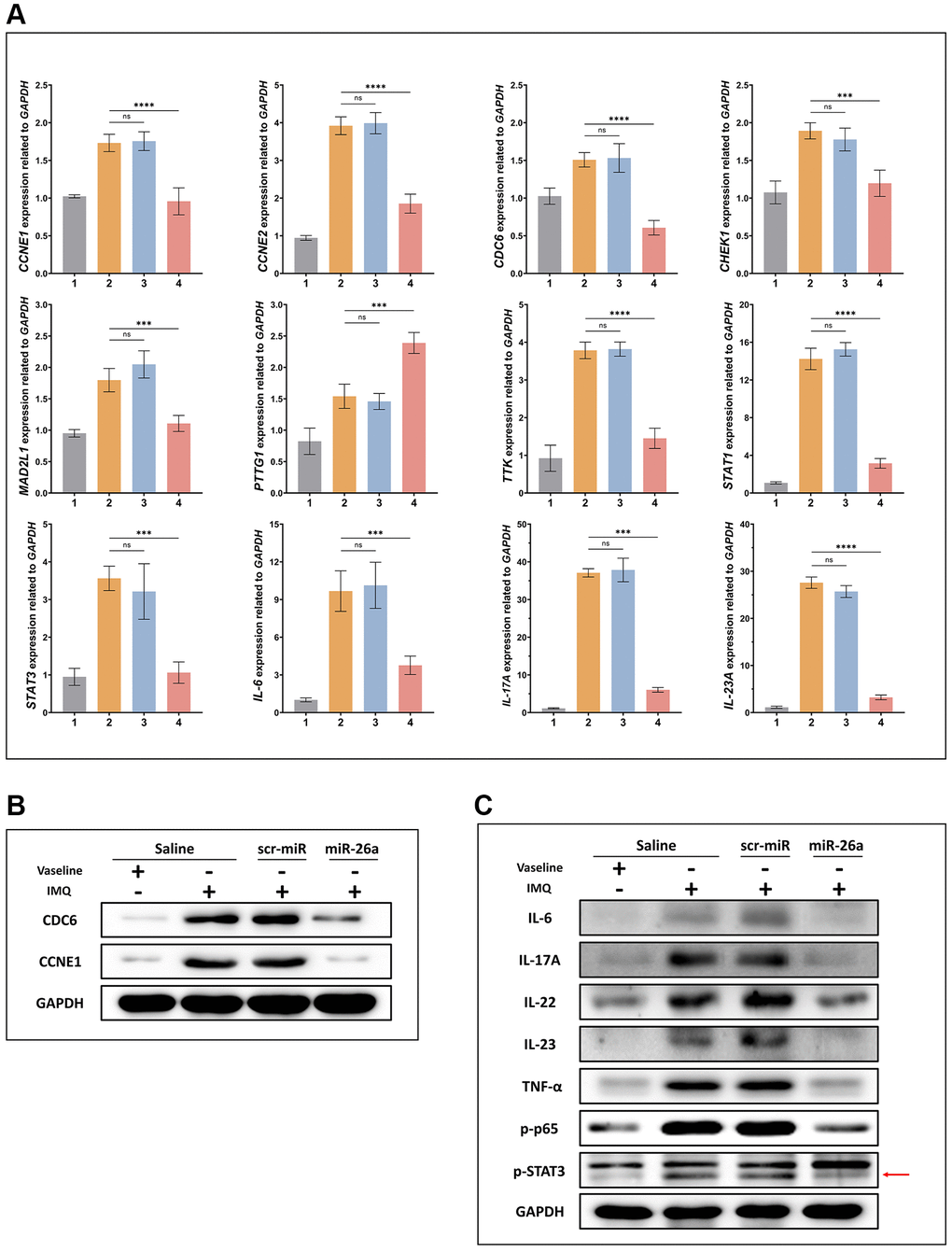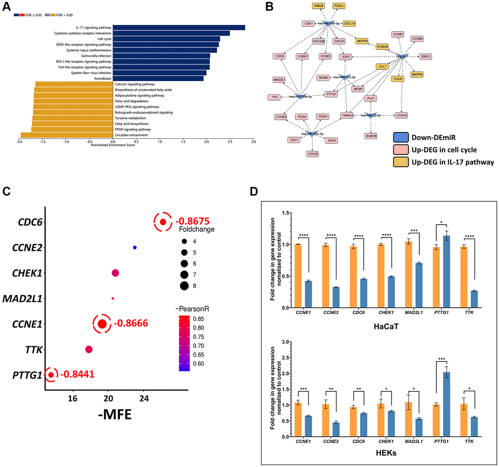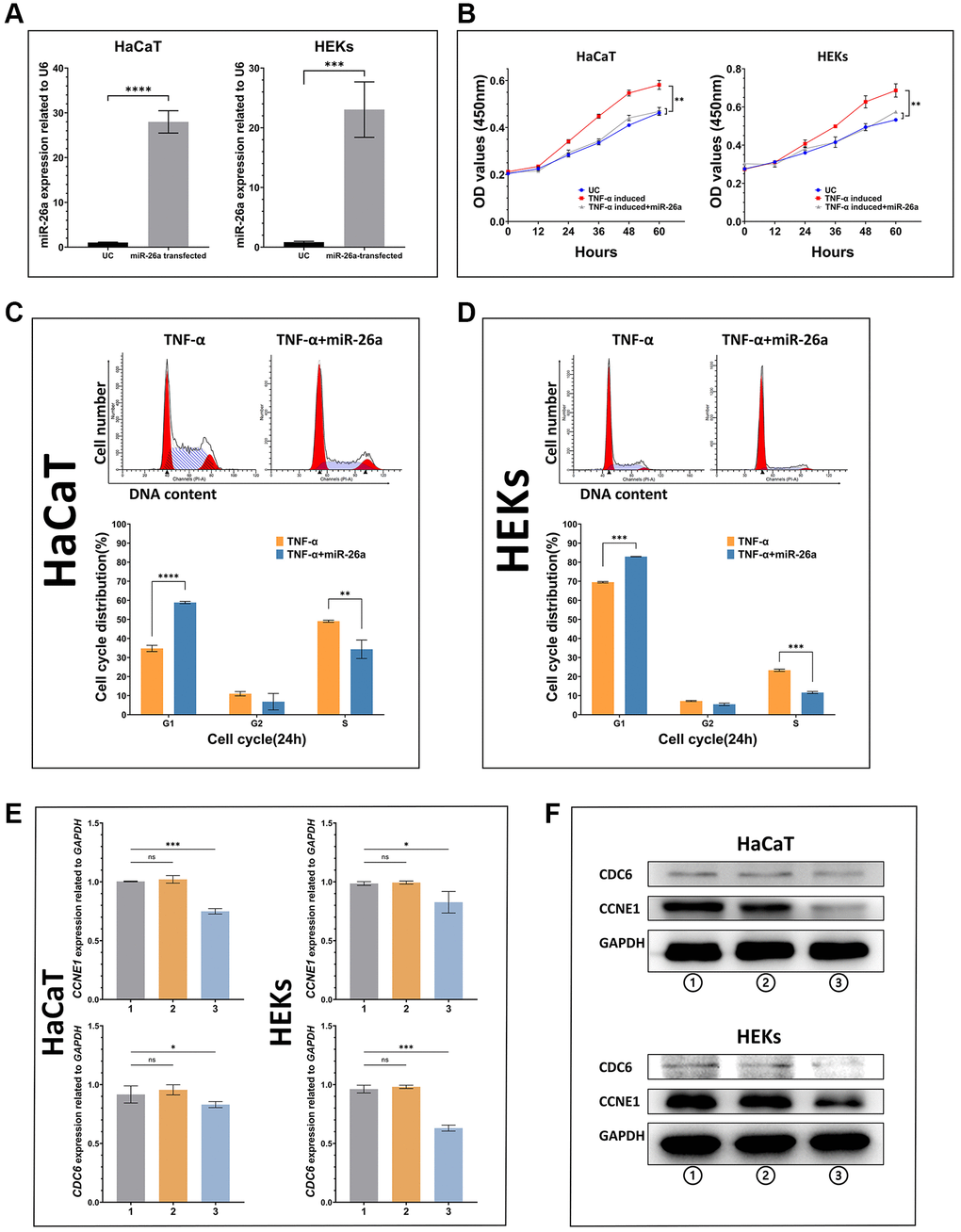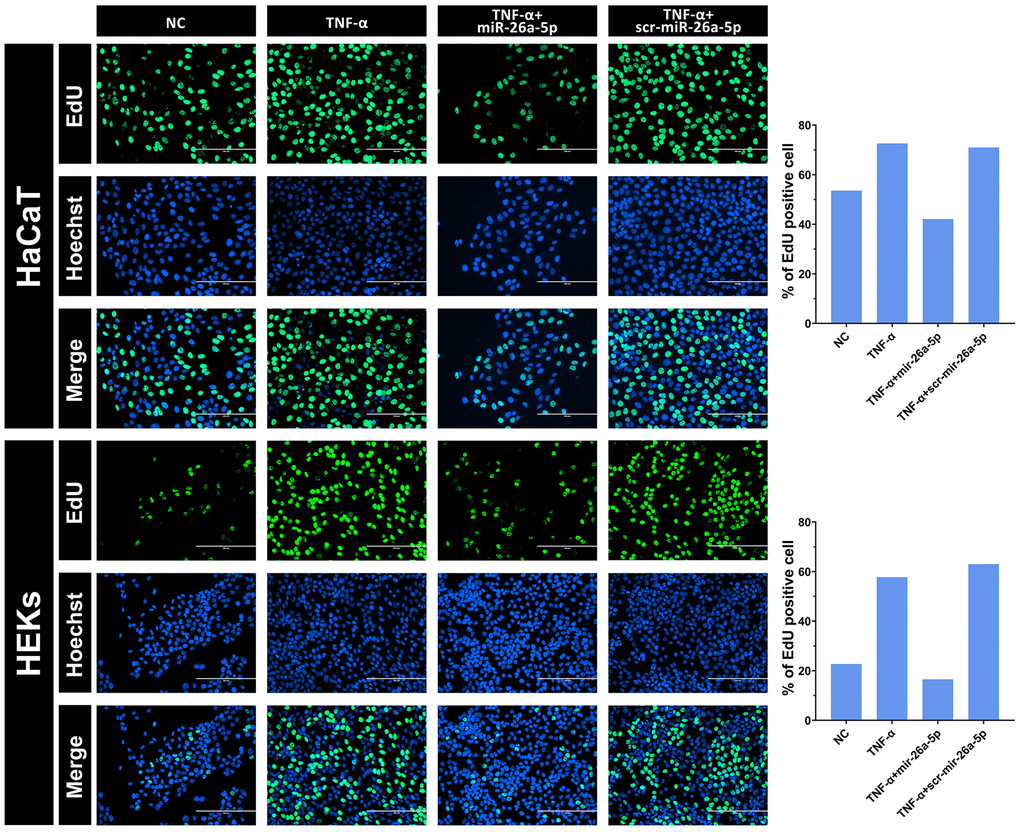 In summary, this study identified 10 potential therapeutic miRNAs from public transcriptome data using bioinformatics approaches. Among them, miR-26a-5p was first verified to suppress the proliferation of keratinocytes both in vitro and in vivo. Our findings support the hypothesis that dual interference of miR-26a-5p on CCNE1 transcription disrupts the initiation of DNA replication via the CDK-RB-E2F pathway. Our work may facilitate the development of small nucleic acid drugs for psoriasis treatment in the future.