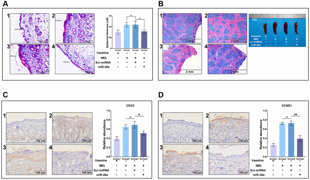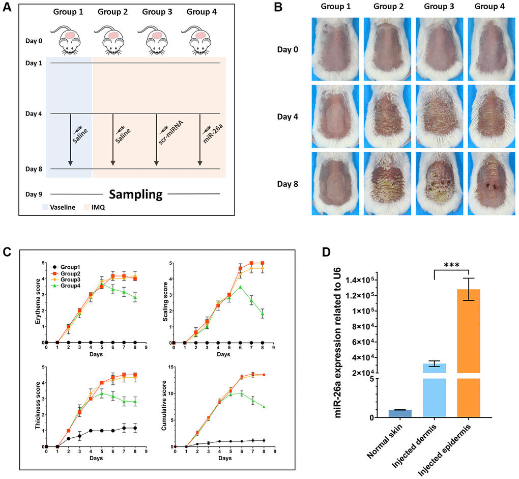 On the 4th day after the psoriasis model was established, the psoriatic mice were randomly divided into three groups: the IMQ group, the scr-miRNA (scrambled-microRNA) (GenScript, Nanjing, China) group, and the miR-26a group. The scr-miRNA group and the miR-26a (10 μg) group were subcutaneously injected with compounds from the Entranster™ In Vivo Kit (Cat. 18668-11-1; Engreen Biosystem Co., Ltd., Beijing, China) and scr-miRNA or miR-26a mimics, respectively. Moreover, the negative control group and IMQ group were injected with the abovementioned transfection reagent in combination with saline. Daily skin changes were recorded with photos by a Canon 700D Single lens Reflex camera.