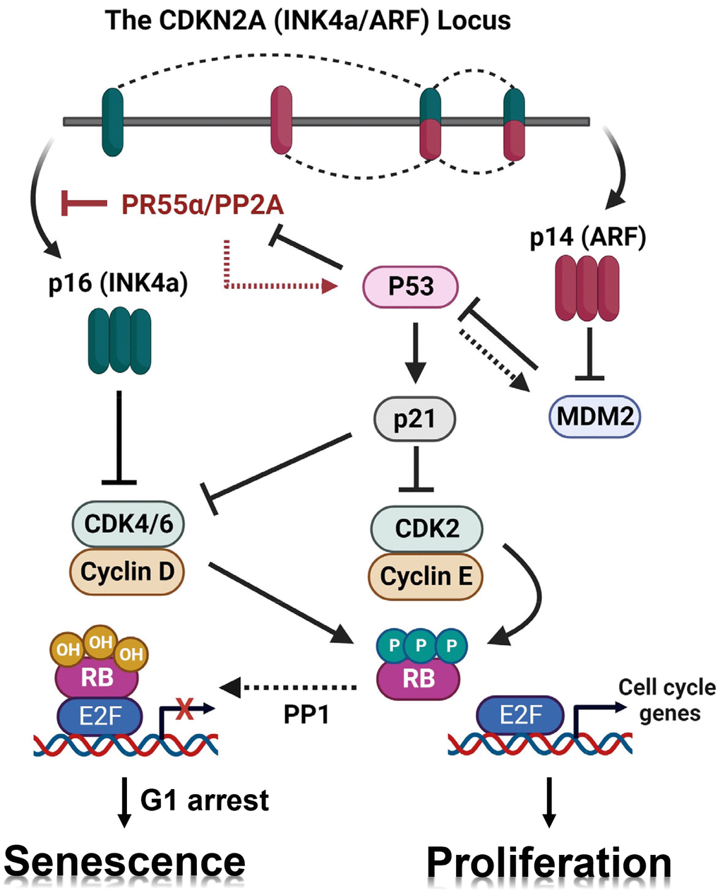 In summary, the results from this study reveal a novel function of PR55a-controlled PP2A Ser/Thr phosphatase complexes in the inhibition of IR-induced senescence, which involves its inhibition of the p16/RB pathway that inhibits E2F activity to block the cell cycle. Future studies will be needed to identify the precise molecular targets of PR55α within the epigenetic and transcriptional regulators of p16 expression. Together, the results of this report establish PR55α-controlled PP2A phosphatase as a critical new regulator of p16 expression and IR-induced senescence. Future studies will need to delineate the interplays among PR55α, p53, and p16 in the maintenance of cellular homeostasis or induction of cellular senescence, as well as how the dysregulation of these pathways promotes cancer or aging.