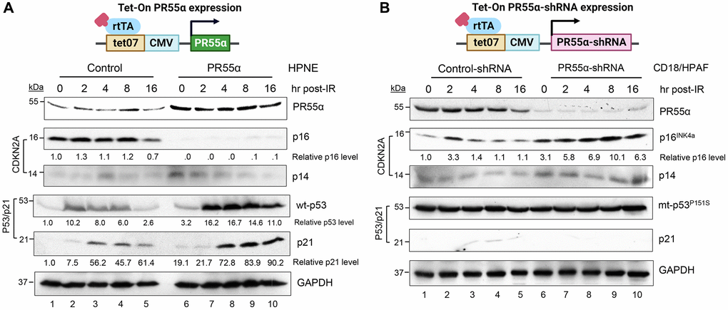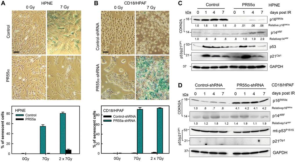 Through retroviral transductions, stable lines of normal HPNE cells were engineered to express a Dox-inducible PR55α, while stable lines of CD18/HPAF cells were engineered to express a Dox-inducible PR55α-shRNA. Since p16 plays an essential role in most forms of cellular senescence, from replicative senescence to stress-induced premature senescence, we assessed the effects of PR55α on p16 expression and premature senescence-induced by IR in the context of both normal cells and cancer cells of the pancreas. To induce senescence in these experiments, we have used a high dose of radiation (10 Gy), similar to doses used in extreme hypofractionation radiation therapy, now made possible by advances in stereotactic radiotherapy [35, 36]. In radioresistant forms of cancer, such as pancreatic cancer, this approach may be producing better outcomes.