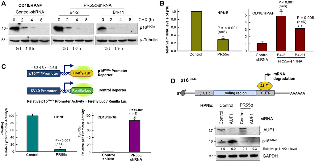 To define the mechanism by which PR55α inhibits p16 expression, we first examined the impacts of PR55α on the protein stability of p16 using the cycloheximide (CHX)-chase assay, as described in our previous work [28]. CD18/HPAF cells expressing the control- or PR55α-shRNA were incubated with 15 μg/ml cycloheximide to block protein synthesis to allow measurements of p16 protein decay. As depicted in Figure 3A, PR55α knockdown by shRNA did not result in a significant change in the p16 protein half-life in CD18/HPAF cells, indicating a lack of effect of PR55α on the p16 protein decay process.