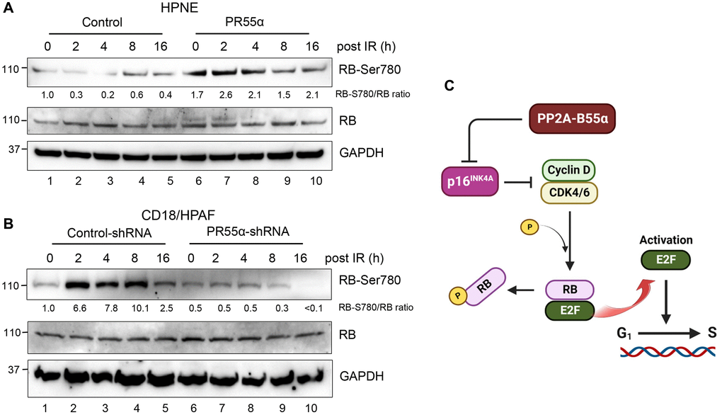 For validation, we examined the effect of PR55α on RB phosphorylation in CD18/HPAF pancreatic cancer cells. The knockdown of PR55α resulted in a ~50% decrease in the steady-state phosphorylation of RB-Ser780 in the log-phase CD18/HPAF cells (Figure 4B, lane 6 vs. 1), which is consistent with the elevated p16 levels in these cells relative to the control cells (Figure 2B, lane 6 vs. 1). Furthermore, IR exposure of control CD18/HPAF cells resulted in the induction in RB-Ser780 phosphorylation, whereas IR exposure of PR55α-knockdown CD18/HPAF cells rather resulted in a time-dependent decrease in RB-Ser780 phosphorylation (Figure 4B). Together, these results support a role for PR55α in the suppression of p16/RB signaling (Figure 4C).