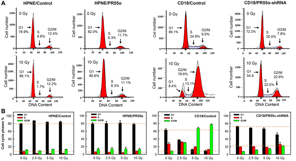 Next, we examined the effect of PR55α on the cell cycle response of CD18/HPAF cells, which express the p53P151S mutant along with very low levels of p16 [37, 54], making these cells deficient in both p53 and p16 functions and lacking a functional G1 cell cycle checkpoint as part of their DNA damage response [53, 55]. However, CD18/HPAF cells still possess an intact G2 checkpoint as part of their DNA damage response, which can function independently of p53 and p16 [56, 57]. As shown in Figure 5, IR exposure of CD18/HPAF control cells (CD18/Control) resulted in dose-dependent increases in cells at the G2/M phases that were accompanied by concurrent diminutions in percent cells at the G1 and S phases, which is indicative of a G2/M cell cycle arrest. In the PR55α knockdown cells (CD18/PR55α-shRNA), while IR still led to a G2/M cell cycle arrest (Figure 5), the percent cells arrested at the G2/M phases was much reduced compared to the irradiated control cells (CD18/Control), by more than a factor of 3 (22.6% versus 78.6%). In the PR55α knockdown cells, IR also did not substantially deplete the percent cells in the G1 or S phases of the cell cycle. Compared to only 8.4% of CD18/Control cells that were retained in the G1 phase after IR, 54.9% of CD18/PR55α-shRNA were still detected in the G1 phase after IR, which corresponds to a 6.5-fold difference in the percent cells in the G1 phase between the two isogenic cell populations (Figure 5). Collectively, these results indicate that, although the parental CD18/HPAF cancer cells lack a functional G1 checkpoint and thus instead respond to IR with the induction of a G2/M cell cycle arrest, the knockdown of PR55α by shRNA was sufficient to induce high levels of p16 expression, which may have then allowed the bulk of the cells to remain in G1 after IR. These results from CD18/HPAF cells are again consistent with the negative regulation of p16 expression by PR55α and subsequent impacts on RB phosphorylation and cell cycle checkpoints.