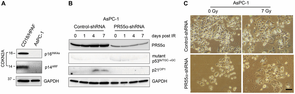 To confirm that p16 expression is required for senescence induction by IR in PR55α knockdown cells, we utilized the AsPC-1 pancreatic cancer cells, which carry a homologous deletion of the CDKN2A locus [37] and thus lack both p16 and p14 expression (Figure 7A). AsPC-1 cells express p53 from an allele that carries a single nucleotide deletion (TGC→GC) at Cys135 that produces a frameshift [37]. Hence, these cells express a truncated and dysfunctional p53 protein, which is also unstable, and are thus devoid of p21 expression (Figure 7B). Subsequently, we tested the effect of PR55α-knockdown on senescence induction by IR in AsPC-1 cells using the SA-β-galactosidase assay. As shown in Figures 7B, 7C, IR exposure of AsPC-1 cells did not lead to senescence induction either in the presence or absence of the PR55α knockdown by shRNA. These results, together with the data obtained from CD18/HPAF cells, which also express mutant p53 but possess a functional p16 (Figures 2B and 6B), suggest a role for PR55α in the inhibition of the p16/RB pathway-dependent senescence induction by IR.