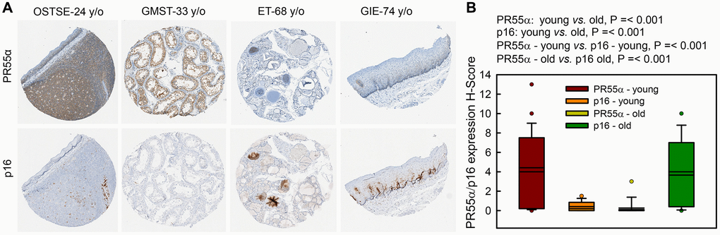 PR55α expression inversely correlates with the expression of p16 in normal human tissues