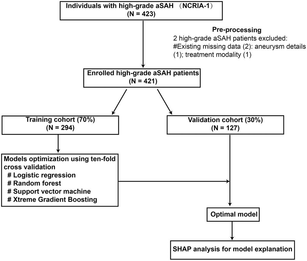 Therefore, this study aims to develop and validate an explainable ML model to predict 12-month outcomes in patients with high-grade aSAH. Besides, the SHAP values of each feature were analyzed to elucidate the overall prediction process. This effort will contribute to the development of explainable and personalized predictive models for prognosis in high-grade aSAH, marking a substantial advancement for the application of machine learning in the field of medicine.