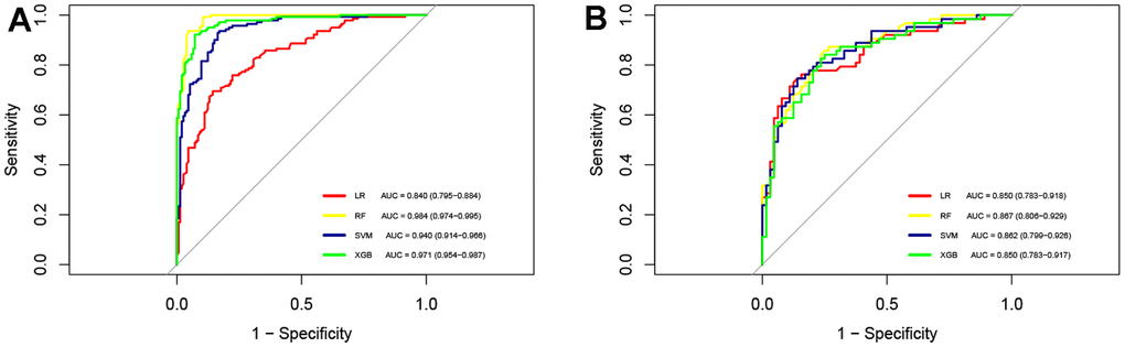 The dataset was divided into training and validation sets in a 7:3 ratio, and the training set was used to develop four ML models, including the logistic regression model (LR), support vector machine (SVM), random forest (RF), and extreme gradient boosting (XGBoost). Moreover, to avoid overfitting in LR, the features were selected and filtered by the Least Absolute Shrinkage and Selection Operator (LASSO) model with the “λ-1se” criterion. Each algorithm was fine-tuned through hyperparameter optimization to optimize model performance. The ten-fold cross-validation was employed to mitigate any potential bias in the data and ensure the generalization of model performance.