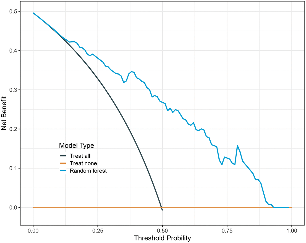 We constructed LR, XGBoost, RF, and SVM models using the training dataset. The prediction performances of these four models are presented in Table 3. When evaluated on the validation dataset, these models achieved AUCs of 0.850 (95% CI: 0.783-0.918), 0.850 (95% CI: 0.783-0.917), 0.867 (95% CI: 0.806-0.929), 0.862 (95% CI: 0.799-0.926), respectively (Figure 2). The confusion matrix and balanced accuracy of four models can be found in Supplementary Table 1. Among them, RF exhibited superior predictive performance with an AUC of 0.867 (95% CI: 0.806-0.929). Conversely, LR and XGBoost demonstrated relatively poorer generalization abilities with AUCs of only AUC of 0.850 (95% CI: 0.783-0.918) and AUC value of 0.850 (95% CI: 0.783-0.917), respectively. Therefore, we selected the RF model for subsequent analysis. Table 4 provides the detailed information regarding multivariable LR analysis. Moreover, we applied decision curve analysis to the RF model. As shown in Figure 3, the decision curve analysis demonstrated that when the threshold probability ranges from 4% to 93%, the net benefit level of applying the random forest model is significantly higher than the “Treat all” and “Treat none” strategies. This suggests that our model exhibits favorable clinical applicability.