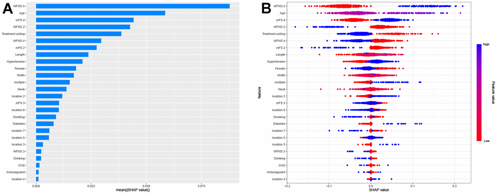 In summary, our study established four ML models (LR, SVM, RF, XGBoost) and selected the RF model to conduct a comprehensive SHAP analysis based on its superior predictive performance. The SHAP analysis revealed the significant contributions of clinical features in predicting long-term prognosis in high-grade aSAH. Elevated WFNS grades and mFS, along with advanced age, were associated with unfavorable outcomes, indicating aggravated neurological impairment and bleeding severity. Conversely, the strategic implementation of endovascular coiling emerges as a promising method to improve patient prognosis by preventing rebleeding and mitigating associated complication. Incorporating these insights into clinical decision-making holds great potential to guide therapeutic strategies and optimize patient neurocritical care. Moreover, the predictive model we developed paves the way for personalized treatment strategies. Patients identified as having an elevated risk of unfavorable outcomes according to our model could gain benefits from intensive monitoring, early intervention, and personalized rehabilitation approaches. In summary, the explainable ML models serve as a valuable tool to improve clinical decision-making regarding the prognosis of high-grade aSAH.