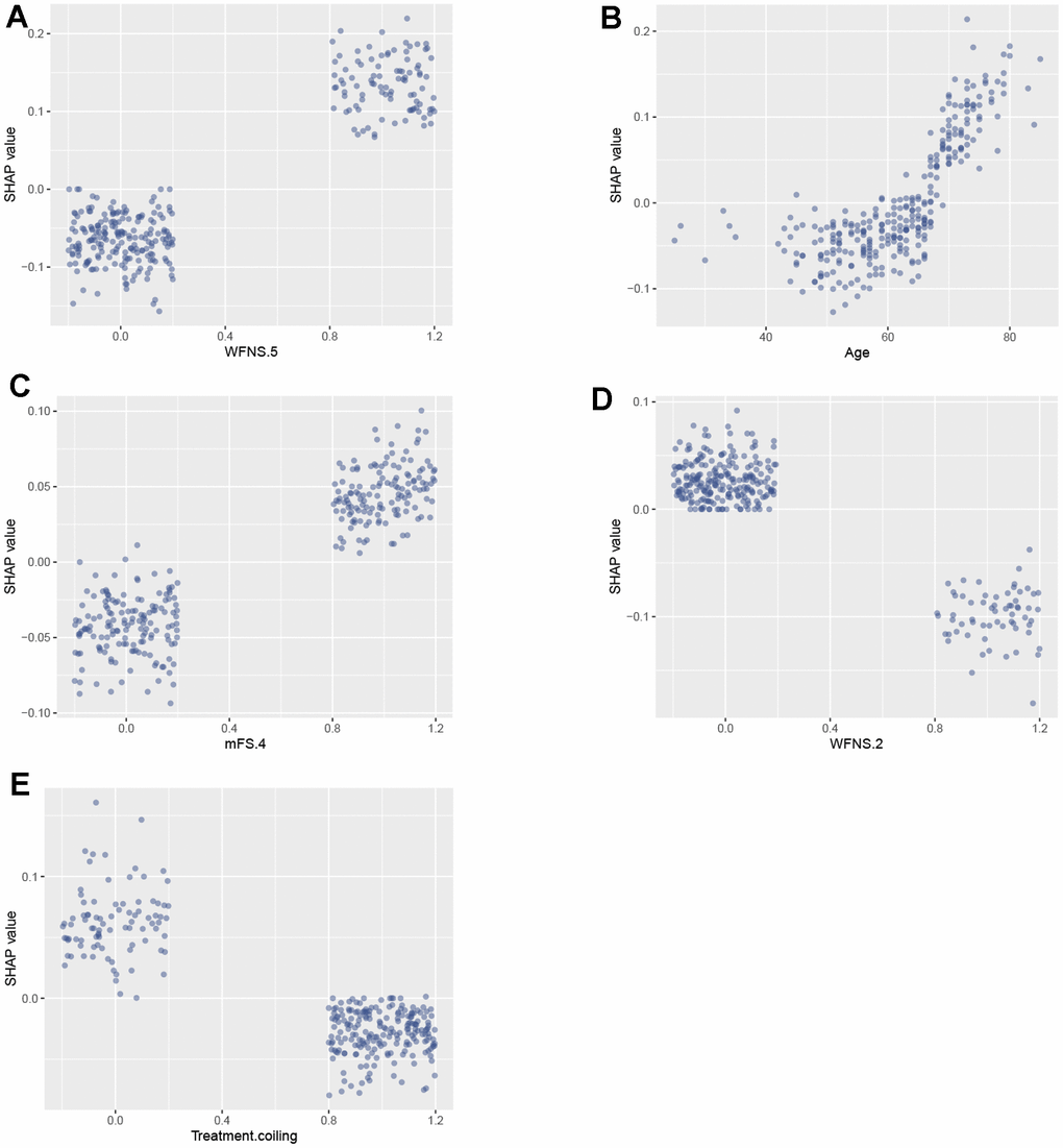 The features specifically associated with poor prognosis included WFNS grade 5, age, mFS grade 4, hypertension, and aneurysm multiplicity. Each of these features exhibited a positive impact and drive the prediction towards poor prognosis. Additionally, treatment of coiling embolization, WFNS grade 2, female gender exhibited a negative impact and drove the prediction towards favorable prognosis. Furthermore, we employed SHAP dependency plots to further investigate the influence of the top five factors on the RF model’s predictions of mortality risk. Figure 5 demonstrates a significant association between WFNS grade 5, mFS grade 4 and advanced age with an increased risk of poor prognosis, while treatment of coiling embolization and WFNS grade 2 are associated with a decreased risk of poor prognosis.