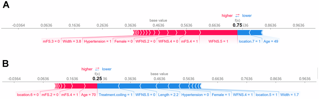 The SHAP force plot analysis was employed to explain the individualized prediction outcomes of two specific samples. Figure 6 illustrates a visual representation of the predictions made by the RF model, with red and blue bars denoting risk factors and protective factors, respectively. The length of each bar corresponds to its feature importance. According to our constructed model (Figure 6A), this patient was predicted to have a 75% probability of poor prognosis. Notably, WFNS grade 5, mFS grade 4, aneurysm width of 3.8 mm, and hypertension were identified as the primary factors influencing this prediction outcome. In contrast, another patient was projected by our model to have a 25% likelihood of experiencing a poor prognosis (Figure 6B).