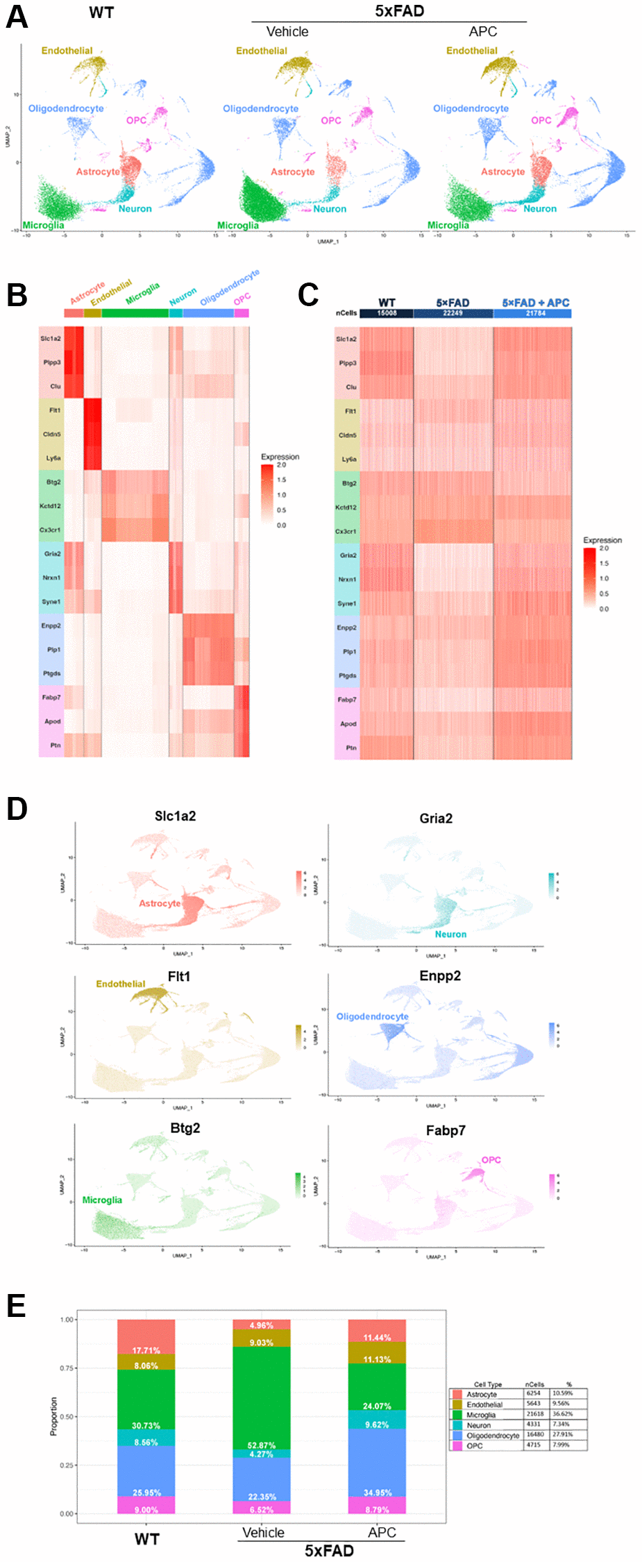 Evolving our previous approach to scRNA seq analysis, the essential integration feature of Seurat v4 once more allowed us to do a comprehensive study between samples [19, 20]. Using canonical marker genes to annotate cells into six neurological cell-types for comparison between samples: Astrocytes, Endothelial cells, Microglia, Neuron, Oligodendrocyte, and Oligodendrocyte Precursor Cells (OPC). While many preceding studies have investigated AD progression transcriptionally [21–23]. Our sc-RNA seq approach provides a new unique perspective on the treatment of AD using exogenous APC. Our study not only observes the transcriptome of 5xFAD mice compared to WT on six main neurological cell-types but measures the impact of APC treatment on the same cell-types. The changes in cell population and transcriptome regulation in each cell-type allows for a greater investigation into phenotypic and physiological alterations occurring during the onset of AD and a five-month APC treatment.