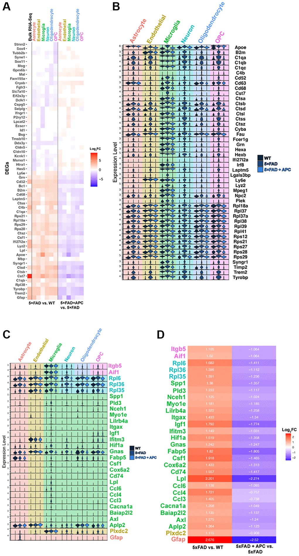 Consequently, we focused on genes that are greater expressed in 5xFAD compared to WT and later strongly downregulated by APC treatment (Supplementary Figure 2A, 2B). Generally, we highlighted exceptionally expressed genes meeting a threshold of Log2FC values ~1 resulting to 77 total DEGs across all cell-types. Many DEGs are globally upregulated in all cell-types in 5xFAD compared to WT. We identified 46 global DEGs that are all remarkably expressed in all 5xFAD cell-types and downregulated with APC treatment (Figure 2B). Many of these globally expressed genes are associated with the transgenic nature of 5xFAD and the onset of AD, their roles in each cell-type are of particular interest. The implications of these global DEGs may be more impactful in a specific cell-type versus another such as Ctsb in microglia, further investigation is needed to verify the physiological impact of specific genes in AD treatment.