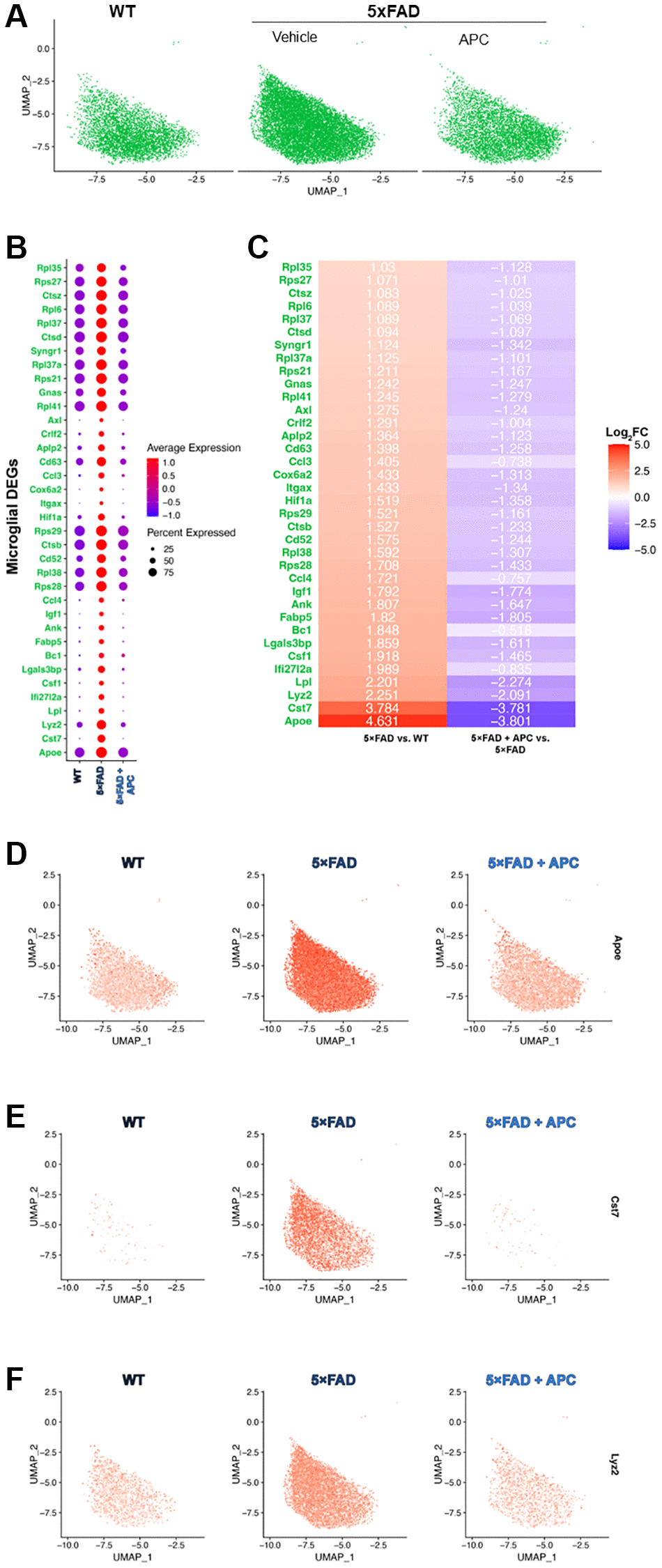 Microglial cells are widely associated with the progression and pathology of AD. Many DEGs that are globally upregulated are the most implicated in microglia regarding AD. These include genes: Apoe, Cst7, Cd63, Cd68, cathepsins (Ctsa, Ctsb, Ctsd, ect.), Irf8, Trem2, and Tyrobp. Though most of the DEGs are modulated by APC treatment, interestingly, C1qa, C1qb, C1qc, Hexa/b, Laptm5 and Ly6e do not seem to alter in expression level extensively in microglia (Figure 2B). The microglial-exclusive DEGs most significantly modulated by APC were Aplp2, Axl, Baiap2l2, Cacna1a, Ccl3, Ccl4, Ccl6, Lpl, Cd74, Cox6a2, Csf1, Fabp5, Gnas, Hif1a, Ifitm3, Igf1, Itgax, Lilrb4a, Myo1e, Nceh1, Pld3, and Spp1 (Figure 2C). The downregulation of the cathepsin family of genes by APC treatment is distinctly remarkable (Figure 2C).