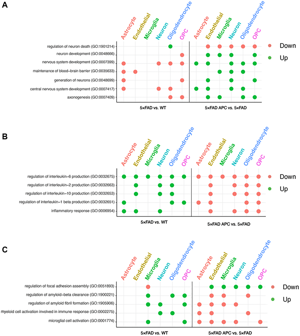 The data generated by differential expression testing allowed for GO term enrichment. This enrichment data provides insight towards the roles of each cell-type in AD progression as well as during APC treatment. Universally, every enriched GO term for 5xFAD cells as a reciprocal in APC treatment (Figure 4A–4C). Our enrichment data shows 5xFAD oligodendrocyte and OPCs downregulate axonogenesis followed by counter upregulation in APC treated mice. Endothelial cells and microglia upregulated axonogenesis in addition to the oligodendrocyte and OPCs in APC treatment (Figure 4A). Central nervous system and nervous system development is downregulated in astrocyte, neuron, and oligodendrocytes in 5xFAD mice (Figure 4A). Corresponding upregulated nervous system development in APC treated mice can be found in every cell-type except for microglia. Downregulation of neuron generation is found in astrocyte and OPCs in 5xFAD mice and is regulated in endothelial cells, neurons, and OPCs of APC treated mice (Figure 4A). 5xFAD astrocyte and endothelial cells were found to downregulate blood-brain barrier (BBB) maintenance and compelling upregulation of BBB maintenance was found in the microglia, neuron, and oligodendrocytes of APC treated mice (Figure 4A). AD mice exhibit considerable neuron death (Figure 4A). Neuron development is downregulated in OPCs, and neuron death is upregulated in oligodendrocytes in 5xFAD mice. Endothelial cells, microglia, neurons, oligodendrocytes, and OPCs all are implicated in the rebound of neurons of APC treated mice. Neuron development is upregulated, and neuron death is downregulated with APC treatment (Figure 4A).