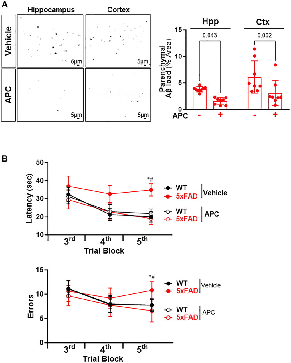 To determine whether APC treatment can reverse the amyloid plaques aggravation in AD, the 5xFAD and C57BL/6 WT mice (10 weeks old) were treated with recombinant APC daily (100 μg/kg/d i.p.) or vehicle (saline) for 5 months. We examined whether administration of recombinant APC influences the development of Aβ pathology in AD. The results demonstrated that APC treatment effectively inhibited the Aβ burden in both hippocampus and cortex (Figure 5A). Compared with vehicle, APC treatment reduced load by 53% in hippocampus and 50% in cortex, it suggests that APC efficiently delay the development of Aβ pathology and amyloid angiopathy. Considering the Aβ aggregation devastating cognitive function, we further analyzed the effects of APC treatment on the hippocampal-dependent spatial memory function with radial arm water maze. The results showed that APC treatment normalized the performance of 5xFAD mice on spatial learning and memory ability in the radial-arm water maze test (Figure 5B). Consistent with Aβ pathology, APC treatment benefits the cognitive function in AD model mice. These data indicated that APC exerts potent neuroprotective activity against AD pathology.