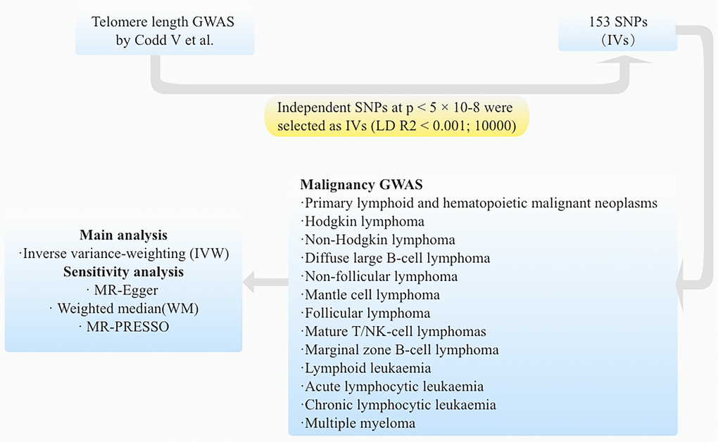 Mendelian randomization (MR) uses genetic variation as an instrumental variable (IV), which has advantages compared with other research methods [12]. This approach utilizes genetic variants associated with the exposure of interest to estimate the causal effect on the outcome, thereby providing valuable insights into disease etiology [13–15]. In recent years, there has been growing interest in exploring the potential association between telomere length and other type of carcinomas using Mendelian randomization analysis [16]. However, the precise causal relationship between telomere length and the hematopoietic malignancies remains unclear.