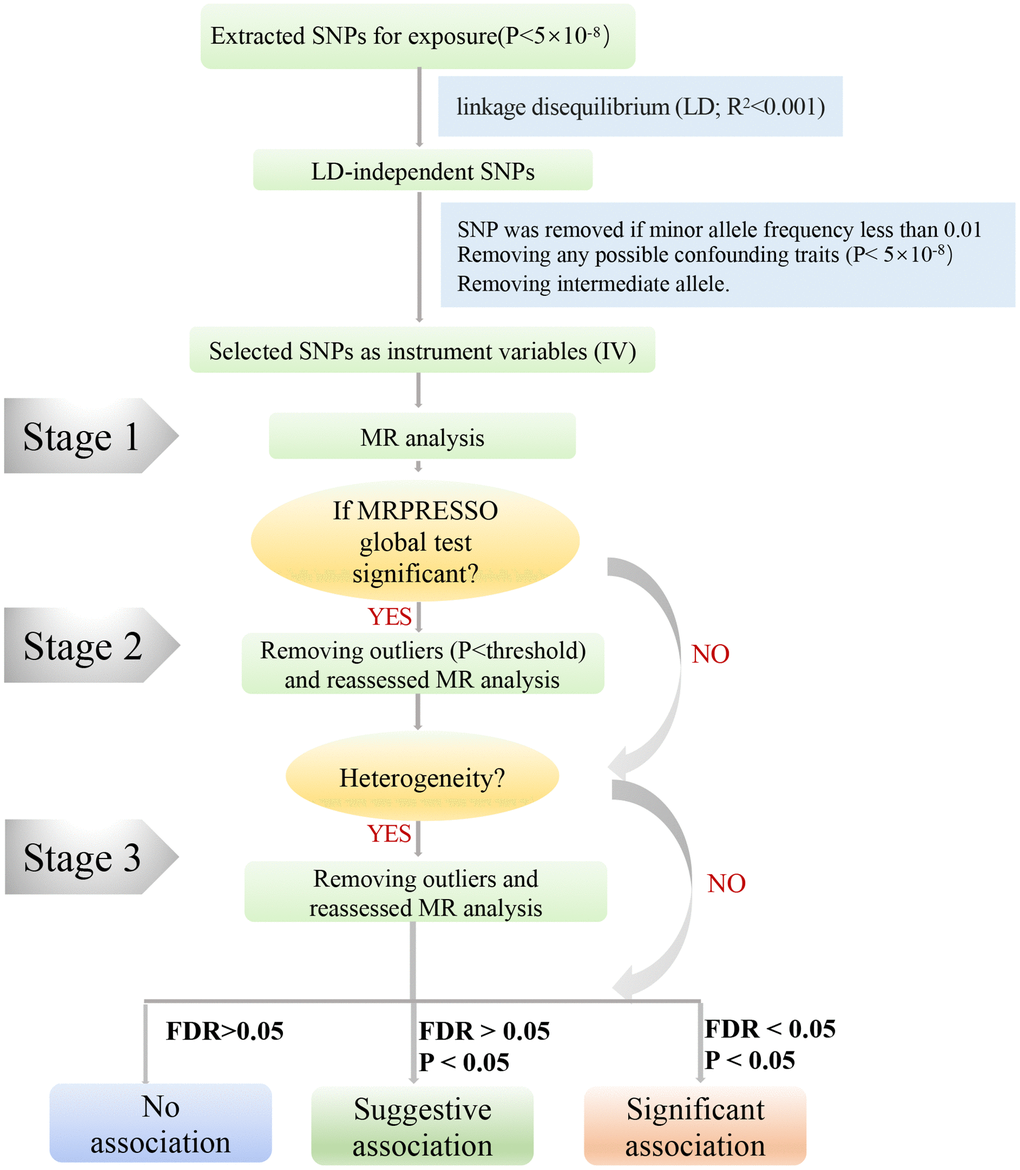 To ensure unbiased results by addressing potential heterogeneity, we followed a three-step approach in our study (Figure 3). In Step 1, we initially conducted MR analysis using the selected SNPs mentioned above, subsequently employing the MRPRESSO outlier test. If any outliers were detected (P < 0.05), we proceeded to Step 2. In Step 2, we reevaluated the MR analysis after excluding all outliers (P < 0.05). If heterogeneity persisted, we entered Step 3, wherein SNPs with a P-value less than 1 in the MR-PRESSO test were excluded, and the MR analysis was reevaluated. Furthermore, we exercised caution in interpreting the results if any potentially influential SNPs were identified through the leave-one-out test.