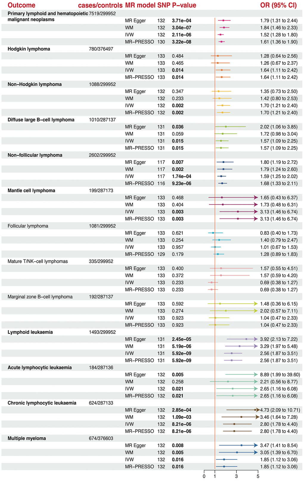 Genetically predicted longer telomere length could increase the risk of all types of primary lymphoid, Hodgkin lymphoma (HL), non-Hodgkin lymphoma (NHL), diffuse large B-cell lymphoma (DLBCL), non-follicular lymphoma (NFL), mantle cell lymphoma (MCL), acute lymphoid leukemia (ALL), chronic lymphoid leukemia (CLL) after FDR control (FDR <0.05; Figure 4 and Table 1). Specifically, a 1-SD increase of telomere length could increase the risk of all types of primary lymphoid (OR = 1.52, P = 2.11×10−6) by 52%, HL (OR = 1.64, P = 0.014) by 64%, NHL (OR = 1.70, P = 0.002) by 70%, DLBCL (OR = 1.57, P = 0.015) by 57%, NFL (OR = 1.58, P = 1.73 × 10−4) by 58%, MCL (OR = 3.13, P = 0.003) by 213%, ALL (OR = 2.65, P = 0.021) by 165%, CLL (OR = 2.80, P = 8.21 × 10−6) by 180%, and Multiple myeloma 1.85 (OR = 1.85, P = 0.016) by 85%. However, telomere length was not associated with increase in odds of follicular lymphomas (FL), mature T/NK cell lymphoma, and marginal zone B-cell lymphoma (MZBL).