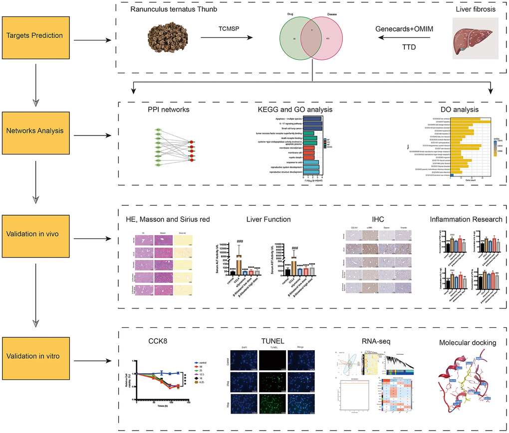RTT is the root of Ranunculus Ternati and contains endolipids and sterols as its main constituents [29]. It is commonly used to treat liver conditions, including infection with hepatitis B virus [10]. Network pharmacology and experimental validation were employed in this study to investigate the bioactive components and therapeutic effects of RTT in the treatment of liver fibrosis.