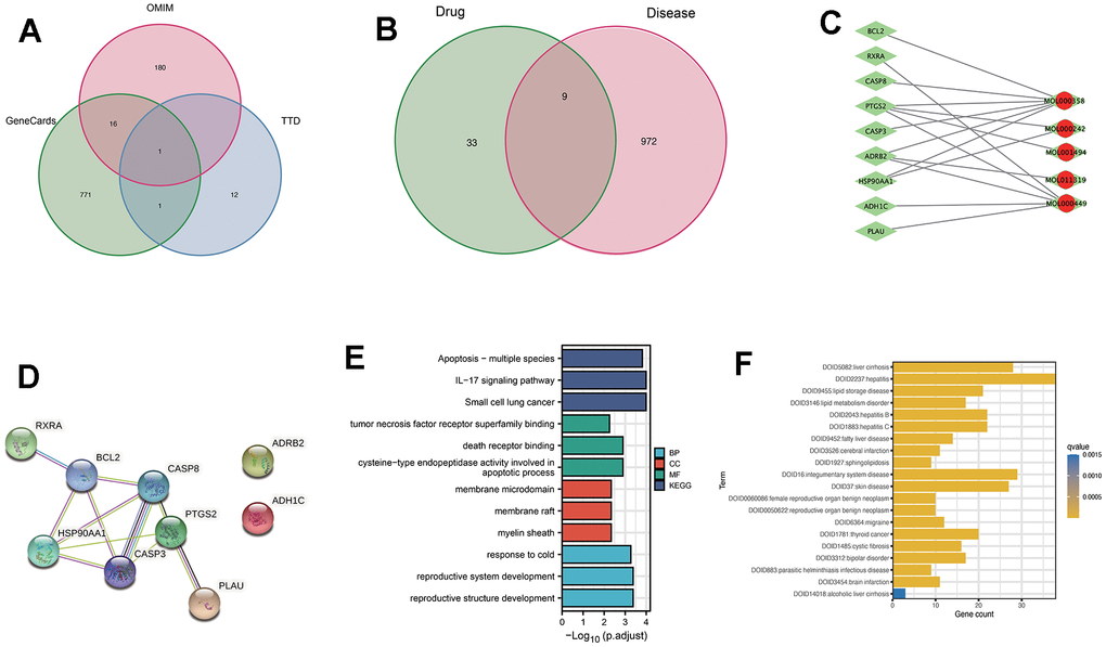 By comparing the targets of the 10 active ingredients with the 972 disease-related genes, nine overlapping genes were identified (Figure 2B). These overlapping genes served as the core targets for further investigations.