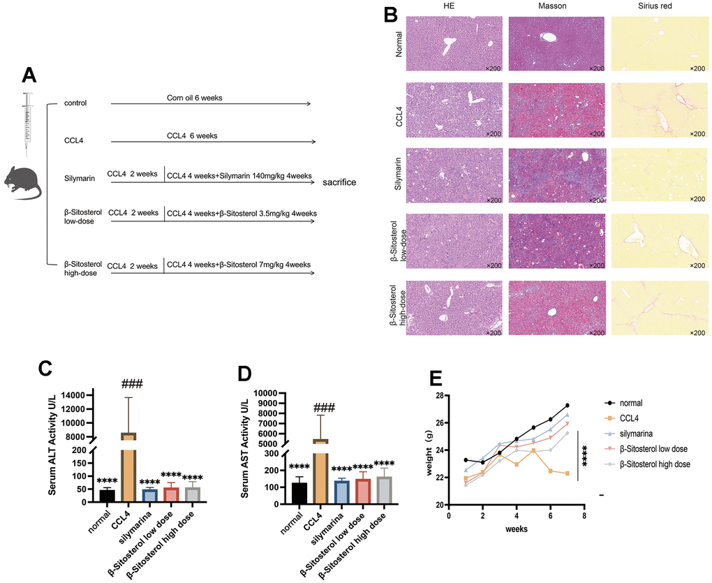 Randomly, thirty mice were divided into five groups of six each: control, CCl4, silymarin (SIL), and β-sitosterol in low and high doses. The control group was injected intraperitoneally with peanut oil, and all other groups were injected intraperitoneally with 10% CCl4 (15 μL/g) three times a week for a fortnight. Starting from the third week, the CCl4 group received saline by gavage, while the β-sitosterol low dose, β-sitosterol high dose, and SIL groups received daily oral doses of β-sitosterol at 3.5 mg/kg, β-sitosterol at 7 mg/kg, and a four-week course of silymarin (SIL) at 160 mg/kg body weight. The doses of β-sitosterol and SIL were determined based on previous studies [24]. Both β-sitosterol and SIL were dissolved in saline for oral administration. The body weights of mice were recorded weekly throughout the entire duration of the study. Total time is 6 weeks, in the seventh week, isoflurane 2% was used to anesthetize the mice deeply, and plasma samples were collected via orbital blood sampling.